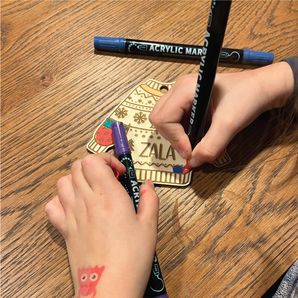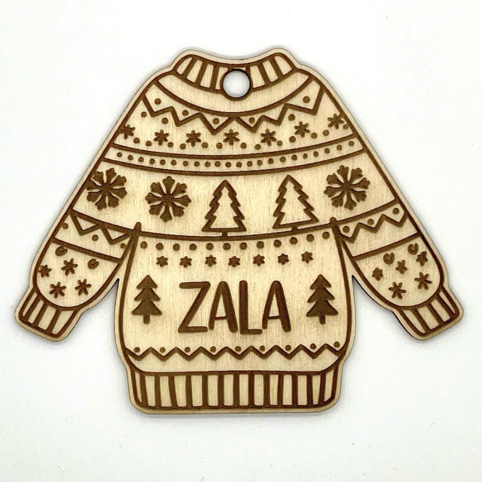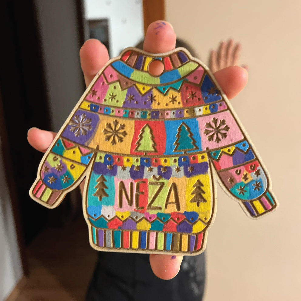 Lesen puloverček z imenom je zabaven božični okrasek, ki ga najprej personaliziramo z vašim imenom, nato pa ga doma pobarvate po svojih željah – čim bolj kičasto, tem bolje!
